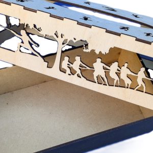 Le « couvercle ». C’est là où sont découpés les motifs. On la referme sur la première, c’est chouette ! Fabriqué en contreplaqué de bouleau de 3mm d’épaisseur, avec des motifs finement découpés représentant des scènes sportives.